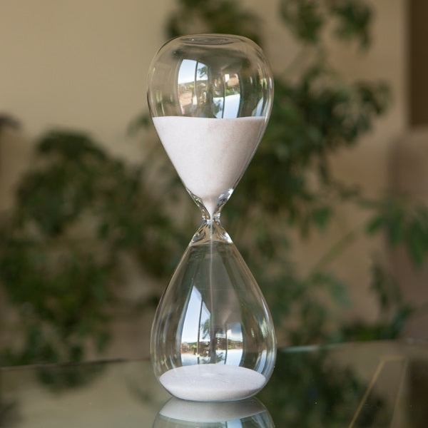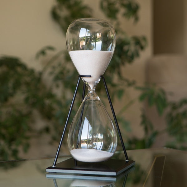 This hourglass with its vibrant yellow or subtle natural sand is perfect for keeping track of important meetings or to watch the soothing sand pour through the globe. Hand blown in England it's also well made and sturdy. Now available in a contemporary black stand to make it more secure and allow engraving to be added!