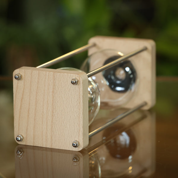 This hourglass has natural finish wood bases and silver metal spindles creating a soft, striking combination. The globes are hand blown and makes a wonderful option for a wedding sand ceremony or sand from a memorable beach vacation!