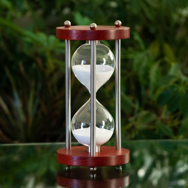 This is a brand new Signature Collection hourglass, handcrafted from solid padauk wood grown in Africa. The color is a reddish-brown, often with dark stripes. It is moderately hard and heavy with a medium texture and large pores and a very smooth surface. An elegant and unique wood, it's reddish brown color will deepen as the wood ages, taking on an antique look. If exposed to prolonged periods of direct sunlight it will turn a beautiful golden brown. Paired with metal spindles it combines traditional and contemporary beautifully. Makes a wonderful gift for a counselor or therapist!
