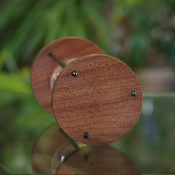 This is a brand new Signature Collection hourglass. Handmade from solid walnut grown in the United States and protected by an oil rubbed finish. A tough wood prized in cabinet making, the walnut color is a rich brown with a fine, open grain. Paired with black metal spindles it combines classic and contemporary beautifully.