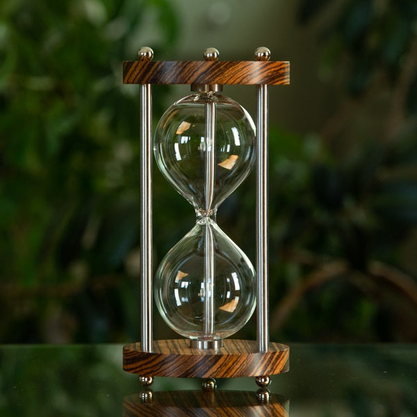 This custom hourglass is brand new to the Signature Collection! Handcrafted from solid zebrawood grown in West Africa. Golden brown in color with pronounced dark brown streaks this is a favorite piece for people who prefer a more modern or bold look as opposed to more traditional. Comes with an empty globe hand blown from the UK to add your own sand and perfect for use during a sand ceremony.