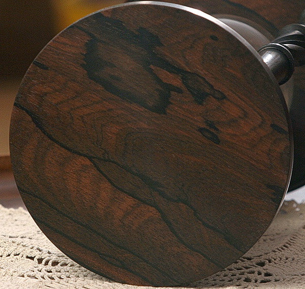 This custom Signature Collection hourglass is handcrafted from solid ziricote wood grown in Central America. Often referred to as a "poor man's" ebony, this is a dark, very striking wood. The color is brown with irregular dark brown and black streaking. Ziricote is the most dramatic member of the Cordia genus, which grows in Central and tropical South America. It it also the heaviest, most dense wood we carry. Combined with glass bulbs hand-blown in England, this sand timer makes a bold statement in any room.
