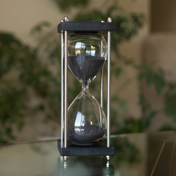 Brand new! This 30 minute hourglass with black wood bases and chrome metal spindles has a clean contemporary look.