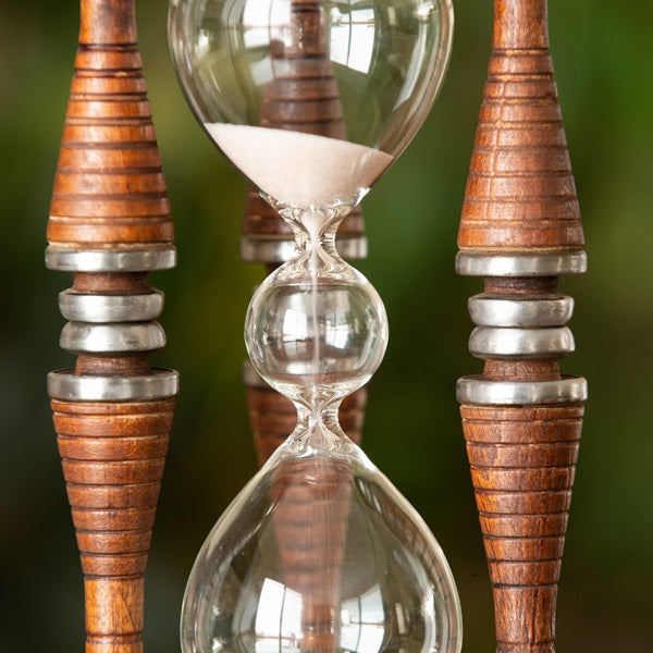 This three tier five minute timer has a history as unique as its style. The timer is composed of pewter shielded antique wood spools found in abandoned textile mills in England. The spools were used to hold thread, cotton, and yarn that were spun into fabric. The spindles and wooden base date back to 1907-1913 and were used in a factory in Calder Valley, Yorkshire which wove the thread into a cotton tartan fabric. A vintage thread spool sticker is placed on the base to give it even more character.