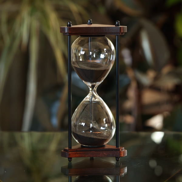 Brand new! This hourglass with triangular wood bases and black metal spindles has a unique contemporary look. Available with white or black sand