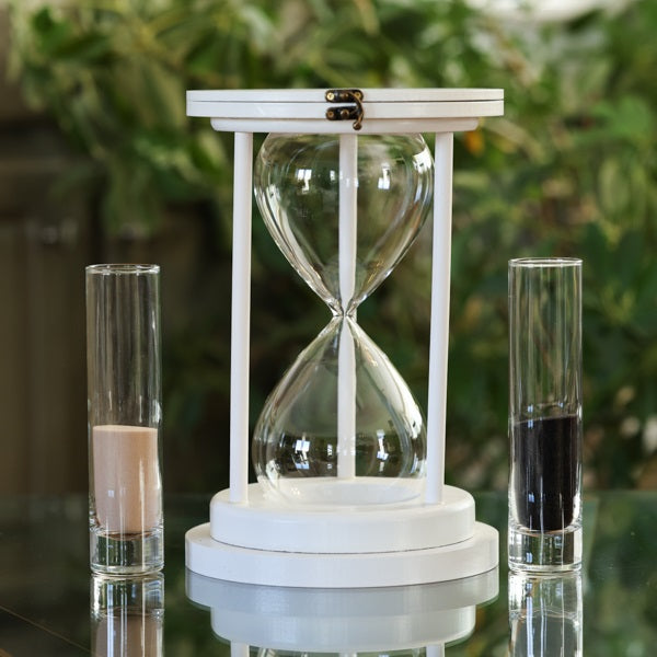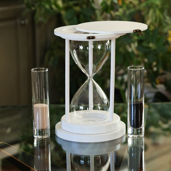 This package has everything you need for the big day! Includes hourglass with empty globe, two containers, and 2 sand colors of your choice. This hourglass is a little different than most of our hourglasses as the top slides to the side and is fastened with a jewelry box latch. We include instructions on how to permanently seal the hourglass if you wish to flip it over!