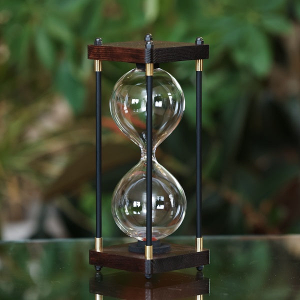 Like it's cousin, this hourglass has rich, brown wood bases and black metal spindles for a clean contemporary look but with gold accents for a little added visual interest. The globes are hand blown in England and makes a wonderful option for holding sand from a memorable vacation or for a unity sand ceremony during weddings.