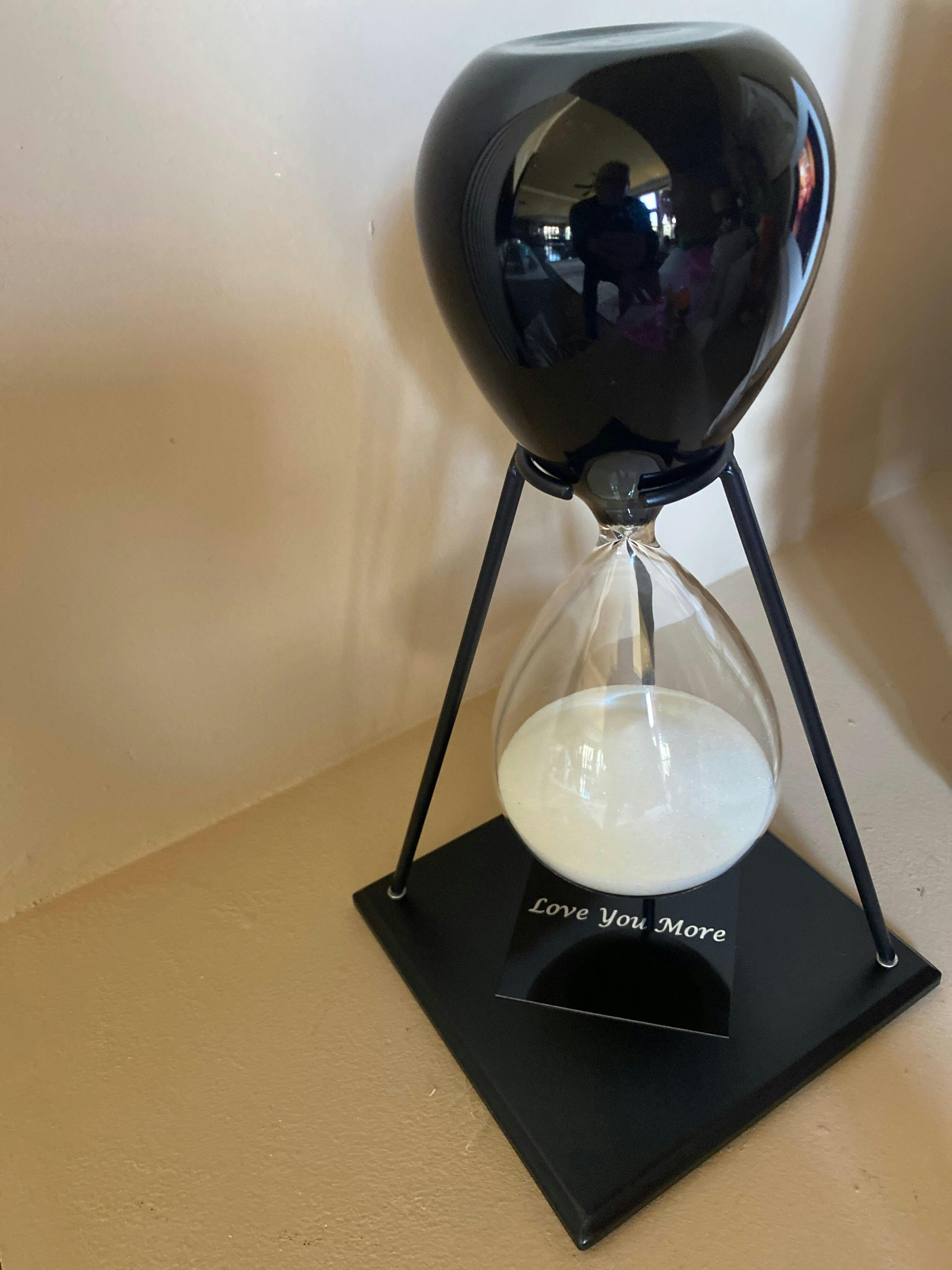 Beautiful hourglass with the gold sand and a black base. It works as a gentle reminder to those in a meeting that an hour has passed.