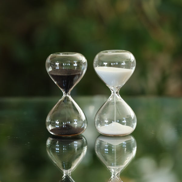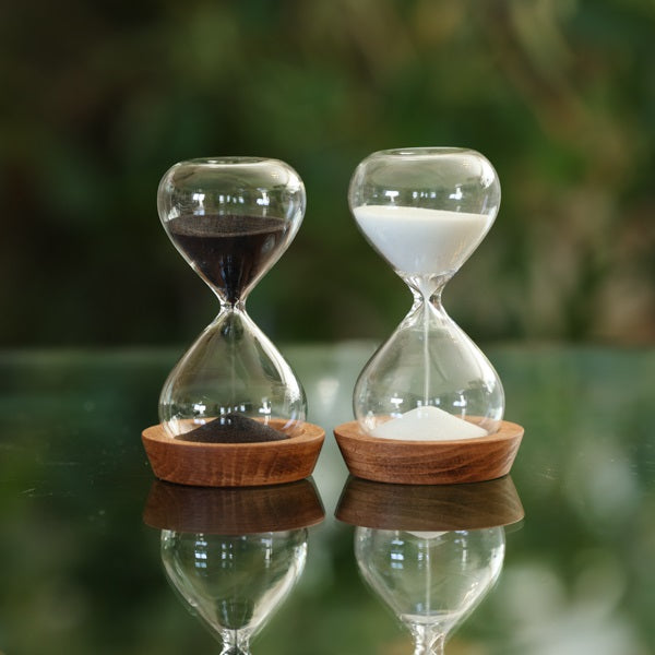 Standing 4" tall this modern, 5 minute hourglass stands out with it's stained wood base and will fit anywhere you place it! This timer is both modern and functional. Measures 5 minutes of time with white or black sand and available by itself or with a wood base